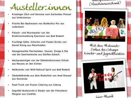 Es erwarten euch leckere Speisen & Getränke von regionalen Anbietern, entspannte Live-Musik mit der Ahorner Kultband Radio Influenza und Spiel & Spaß für Kids mit dem Coburger Kinder- und Jugendtheater.