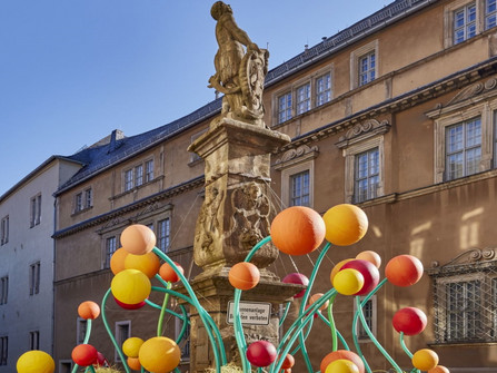 Where Rückertstraße meets Steingasse is the Rückert Fountain, directly opposite Ehrenburg Castle. It was built of wood in 1259. At that time it was called the monastery fountain, later it was temporarily called the castle fountain. After being repaired in 1550, the stone box and the fountain column that still exist today were rebuilt in 1680. The Rückertbrunnen was an important part of Coburg's water supply, as it distributed water via a pipe system to other fountains in the city. On its column in the centre is a sculpture depicting Coburg's patron saint, Saint Mauritius, facing the Morizkirche church.