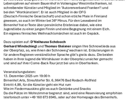 Den Anfang macht am 13. Dezember 2025 ein Wohnzimmerabend. Literatur trifft Musik, unter dem Motto: was haben Westmittelfranken, Finnland und die Oberpfalz gemeinsam und wie verständigen sie sich.
