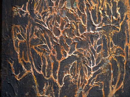 „Bei meiner Technik handelt es sich um ein Abklatschverfahren mit Acryl auf Leinwand, dabei entstehen Texturen, die von der Struktur her an Äste erinnern. Diese kombiniere ich mit realistischen Elementen“, erklärt Verena Zielowski.